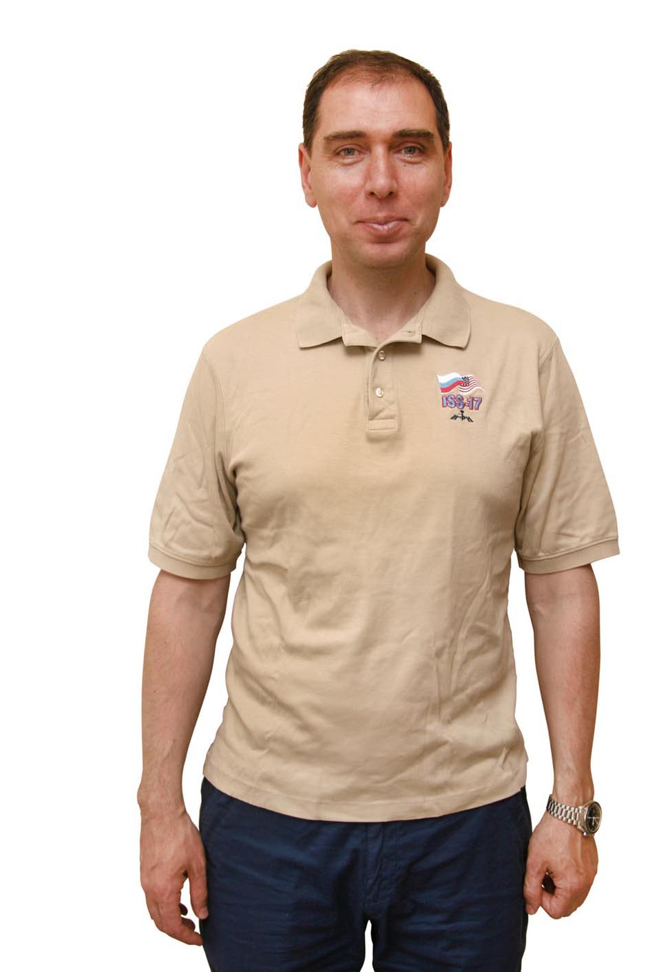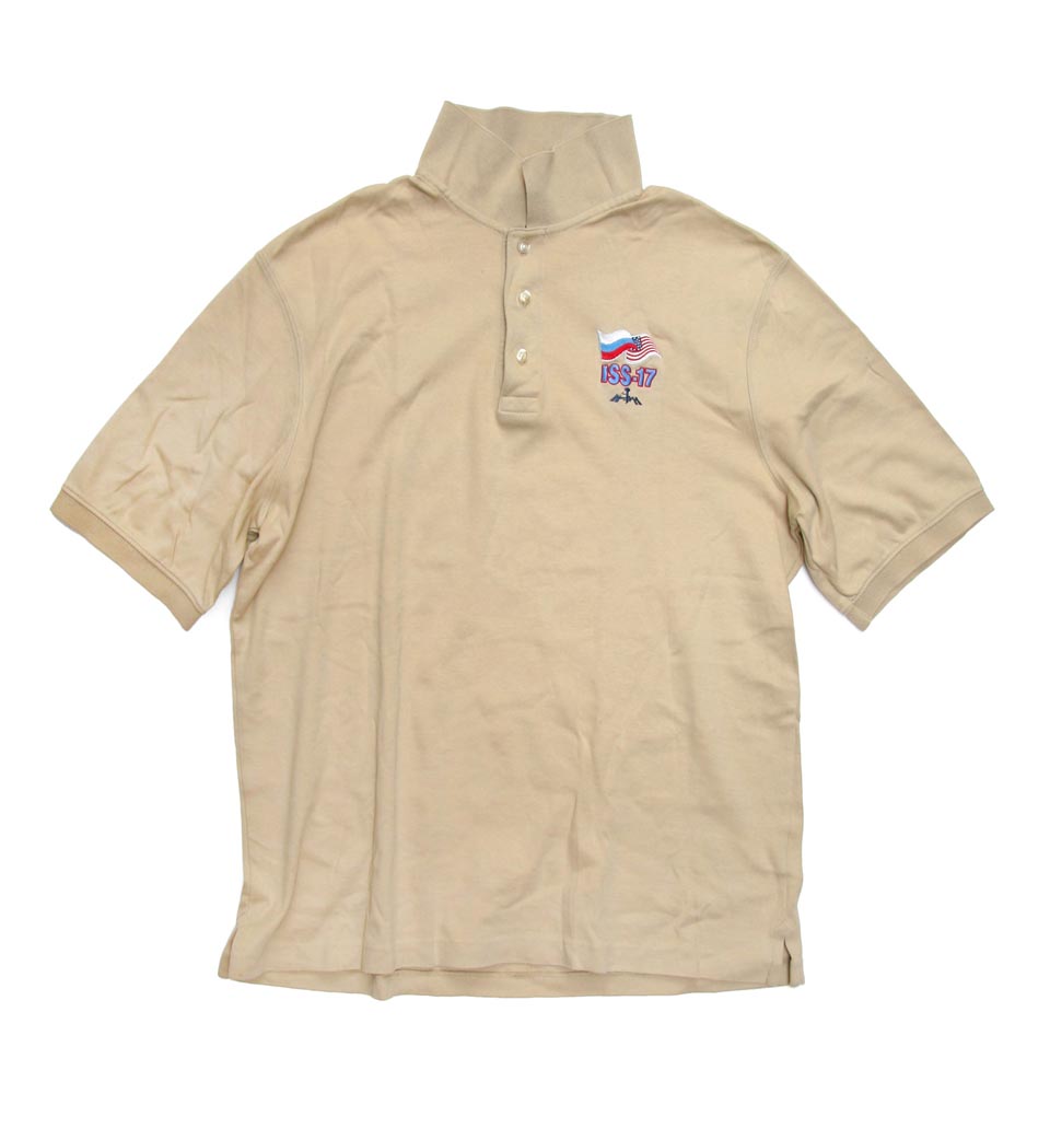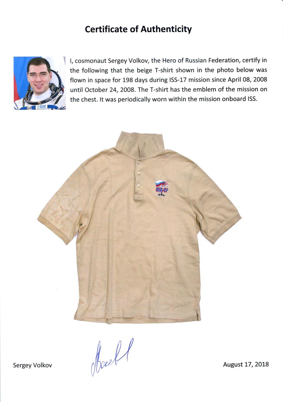 The beige T-shirt presented for sale here was worn by Russian cosmonaut Sergey Volkov in space during his first space mission ISS-17 in 2008. The T-shirt has the emblem of the mission on the chest. It returned on the Earth together with Sergey onboard Soyuz TMA-12A.