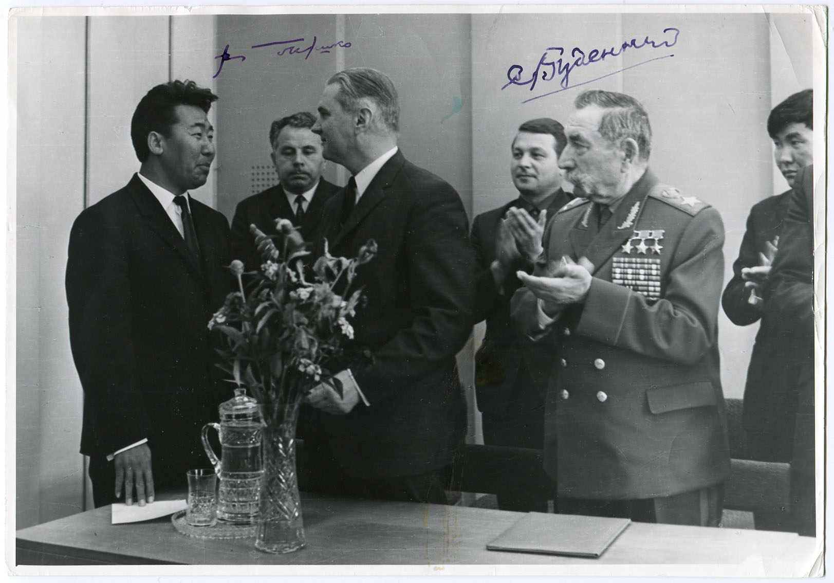 It's offered to your attention the unique Soviet photo of two famous people in the USSR history - early Soviet space program Chief Designer Valentin GLUSHKO (third from the left) and Marshal Semen BUDENNY who came from cavalry of the civil war in Russia in 1920-s (fifth from the left) - they participated at a meeting with some people. Glushko and Budenny are the two people who personify two eras at a time - the past era of cavalry army and the future era of space exploration! The photo has the original signatures of Glushko and Budenny.
